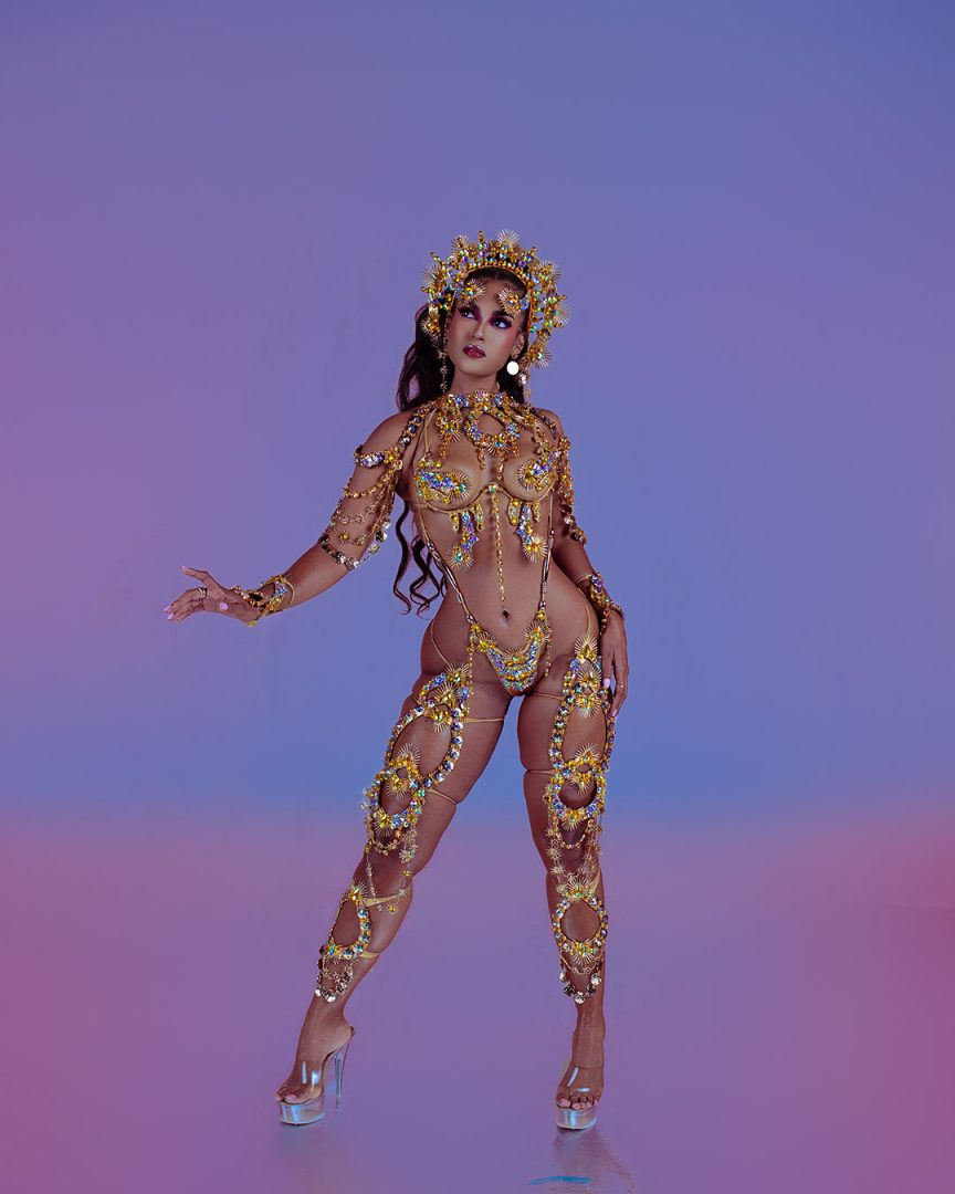 Includes: Wire Bra, Thong, Head Piece, Neck/Shoulder Piece, Wrist (pair), Arm (pair), Upper Thigh (pair), Lower Leg (pair), Ultra Backpack.